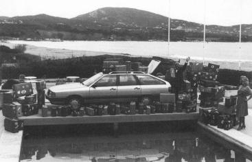 Dann stürzten sich zehn Hotelpagen auf den Wagen, öffneten die Heckklappe und entluden - vor den Augen der ungläubig staunenden Pressevertreter - den AUDI 100 Avant. Fast 100 Koffer der unterschiedlichsten Größen schleppten die Pagen an den Gästen vorbei ins Haus. Ein unglaubliches Experiment!